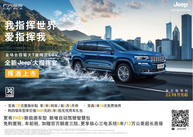 全场合四驱大7座纯正SUV的全新Jeep+大指挥官与超效新能源实力的全新Jeep大指挥官PHEV的同时加料上市,将令大指挥官家族的产品实力得到更进一步加强,并使Jeep大指挥官家族继续成为中大型高端SUV实力双标杆。79年历史的Jeep品牌将始终以强大的全路况实力, 激发不满足于平淡生活的人们去探享极富激情和感召力的生活方式。Jeeper们指挥着关于探索、自由和未知的精彩世界,对于家人、生活与事业的所有热爱则指挥Jeeper,而不管你们在哪里,Jeep会一直在人们背后,全力支持你的一切梦想。