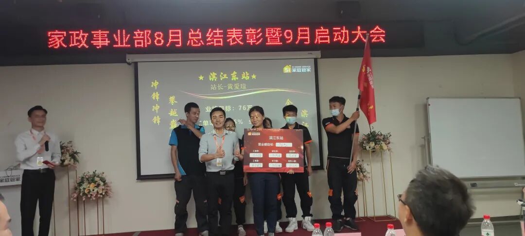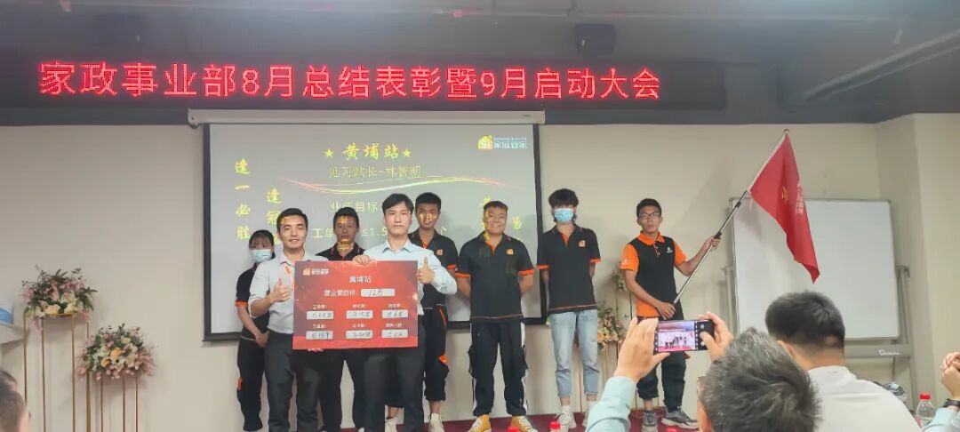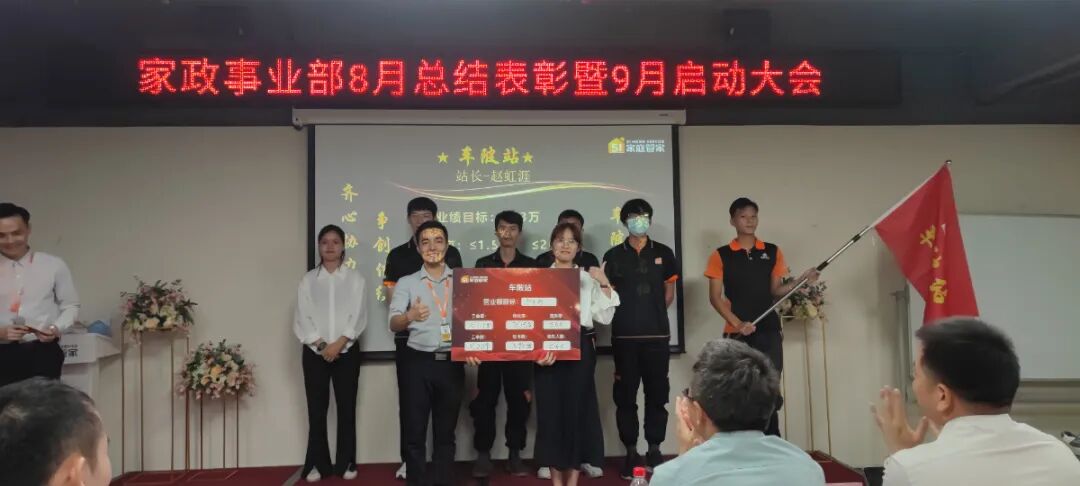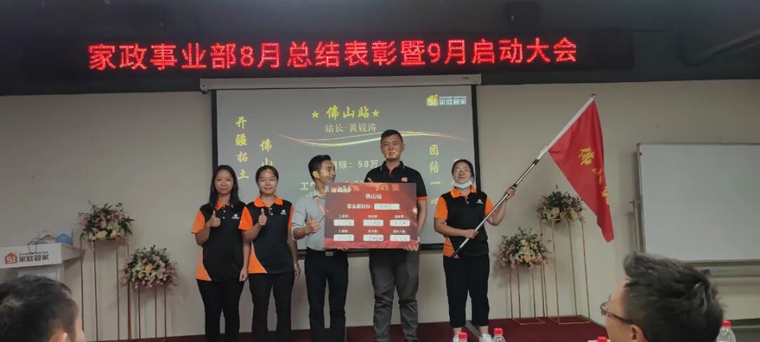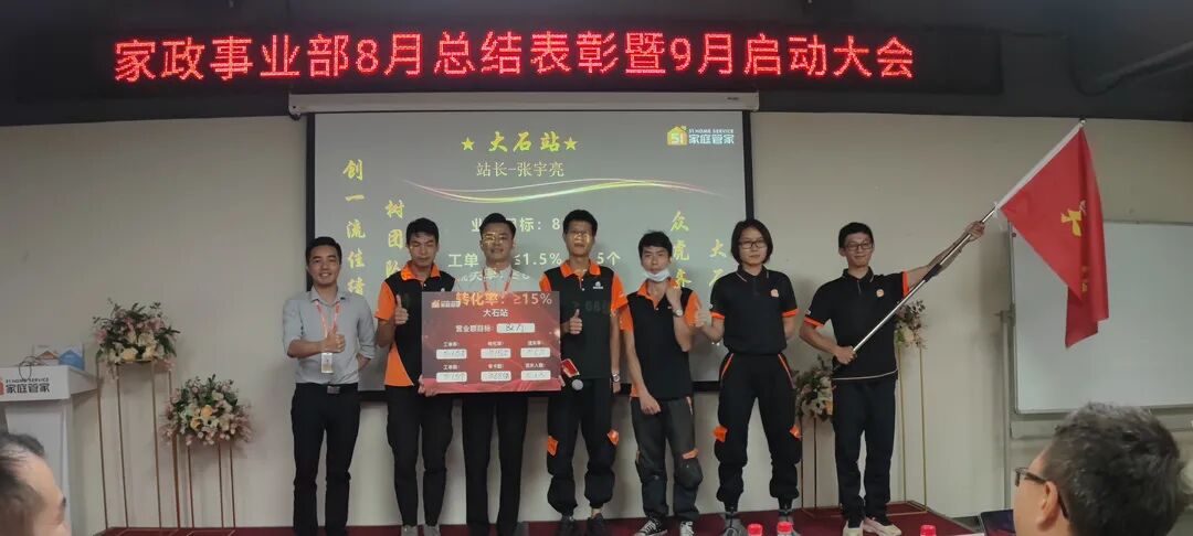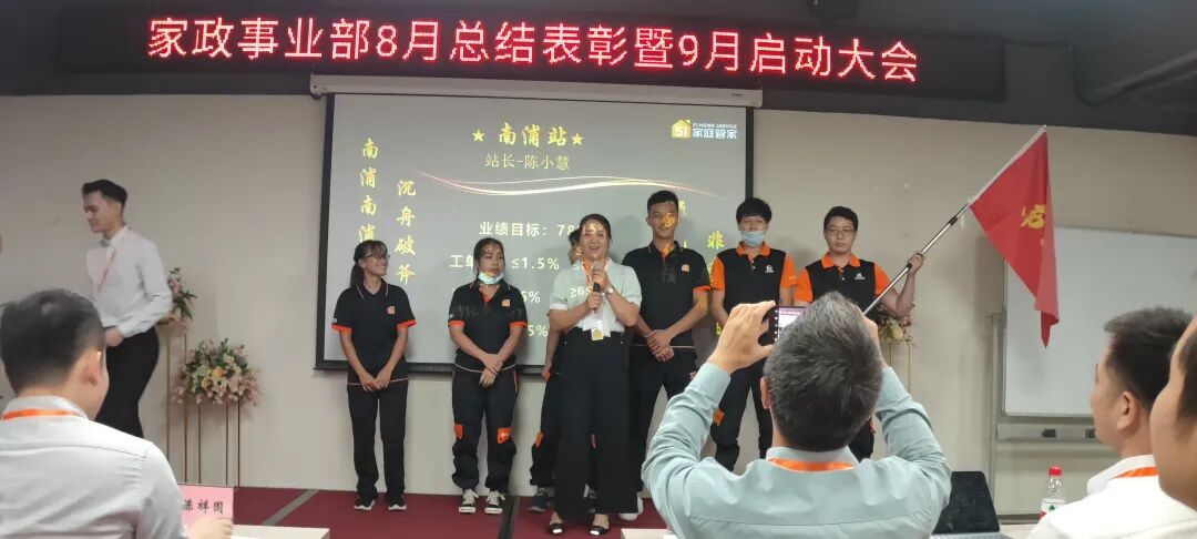 颁奖结束后进入各个站点团结一致树立业绩目标仪式,整个会议氛围饱满,大家都有股雄赳赳气昂昂的气势,势必会完成9月业绩目标的信心。同时为了鼓励家政事业部的小伙伴9月继续保持良好的工作热情,公司9月设最高人均时长组、金牌排班之家、金牌转换之家、金牌人气之家、服务标杆之家、金牌服务站、金牌服务组、欠缺奋斗站奖项,加油,力争9月的奖金和荣誉!