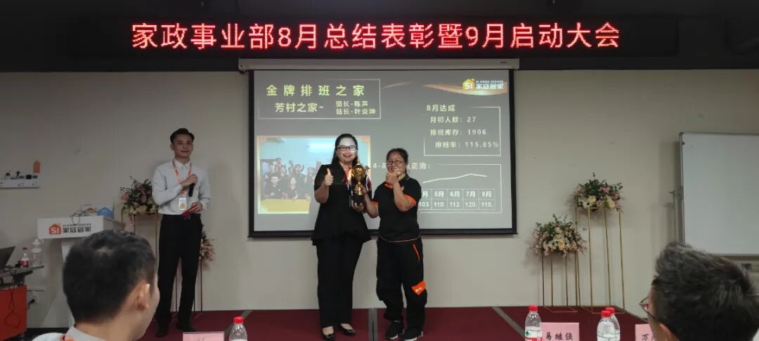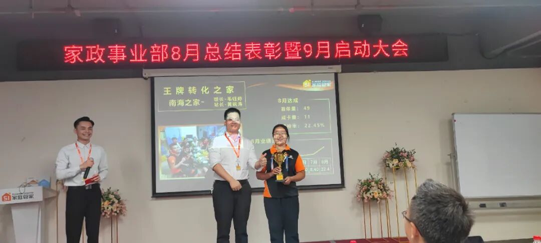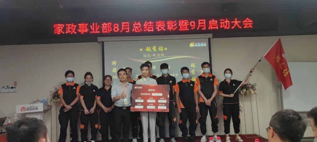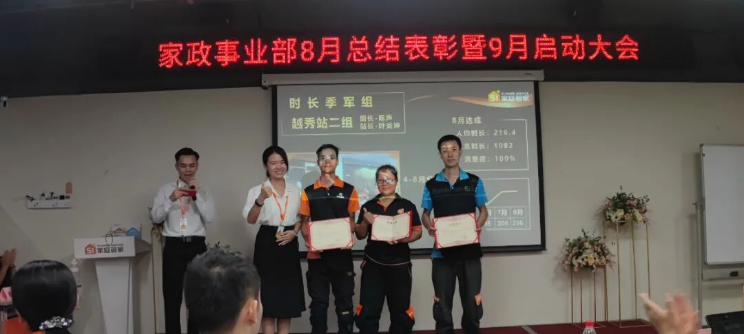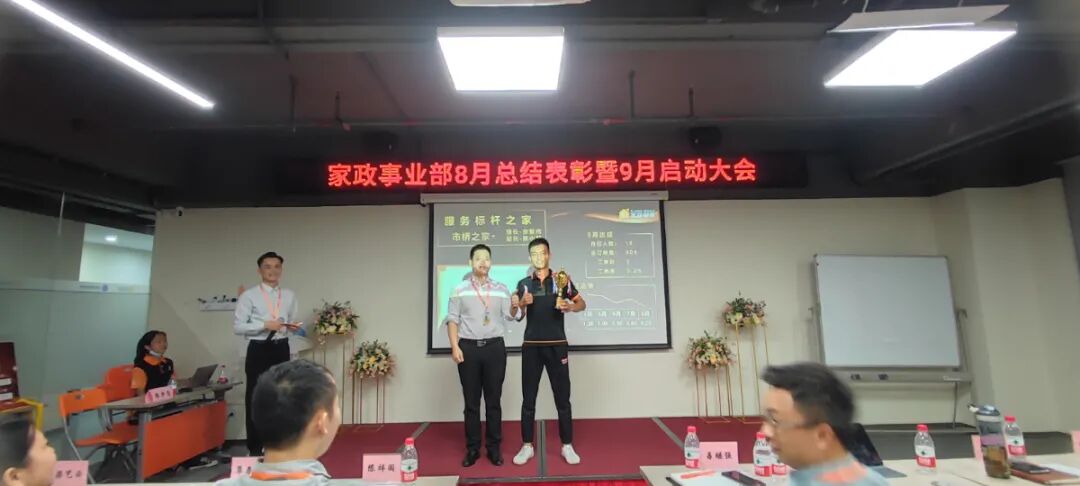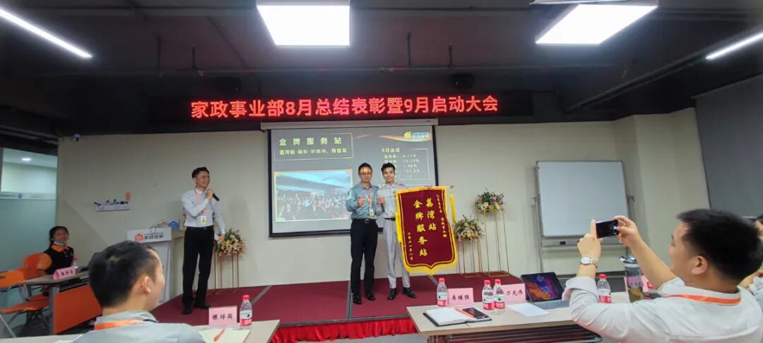 颁奖结束后进入各个站点团结一致树立业绩目标仪式,整个会议氛围饱满,大家都有股雄赳赳气昂昂的气势,势必会完成9月业绩目标的信心。同时为了鼓励家政事业部的小伙伴9月继续保持良好的工作热情,公司9月设最高人均时长组、金牌排班之家、金牌转换之家、金牌人气之家、服务标杆之家、金牌服务站、金牌服务组、欠缺奋斗站奖项,加油,力争9月的奖金和荣誉!